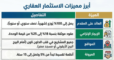 نظام العوائد الاستثمارية: مقدم 50% مع عائد يصل إلى 100% من قيمة المقدم يُصرف على مدار 5 أو 6 سنوات.